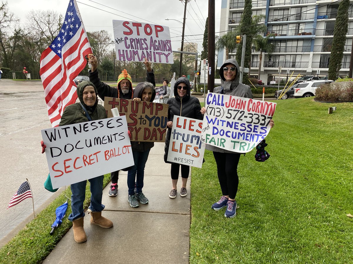 #WitnessesAndDocuments & fair trial. Defending democracy in#HTown Week 155 - 3 years#TuesdaysAtCornyns protest EVERY Tuesday 11:30-1:00 @ 5300 Memorial Dr#Houston#CountryOverParty#VisibleIndivisible#ComplicitCornyn#StandOnEveryCorner#WhyIMarchpic.twitter.com/SmF95nSPf3