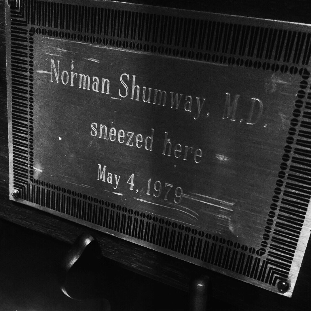 Norman Shumway famously hated when anyone sneezed in his OR. When the inevitable happened on 5/4/79 his perfusion team had this plaque made and hung it in his OR.