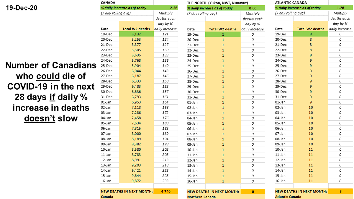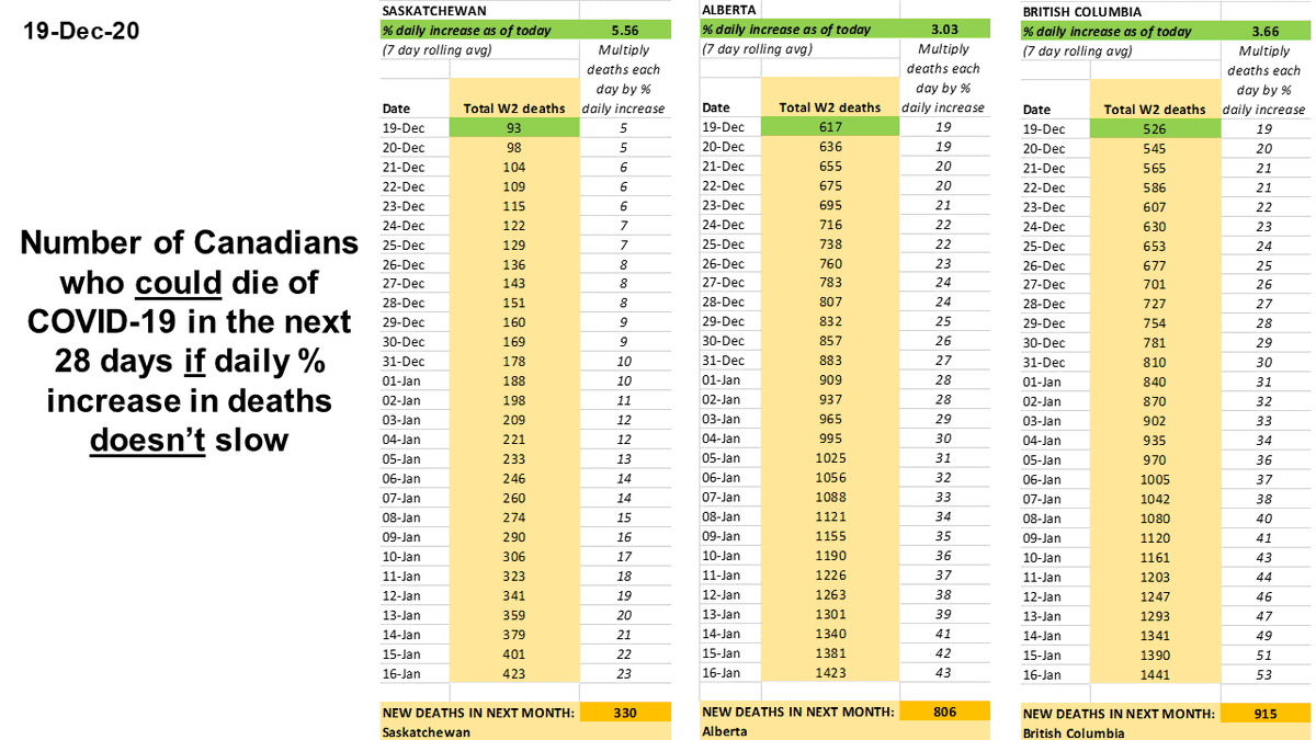 #Canadians died of#COVID19 in the last 28 days. Today, deaths are increasing 2.4% daily. If this doesn't slow, 4,740 Canadians could die in the next 28 days 1,392 QC 1,030 ON 915 BC 806 AB 515 MB 330 SK 3 Atlantic CAN 0 Northern CAN We MUST#StayHomeSaveLives pic.twitter.com/r0DNbEvw2e