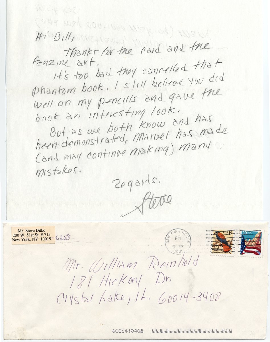 In 1995 I got to ink Steve Ditko on Marvel's Phantom 2040. Later in 1999 I was invited to do the cover for the fanzine Ditkomania. After it was published I sent him a copy, and he sent me a letter! Never posted this before. It has interesting comments.