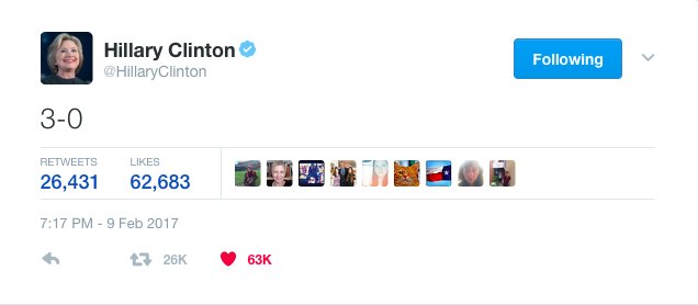Damn. Hillary doesn't tweet much, but it only took her 3 characters to break Twitter.
