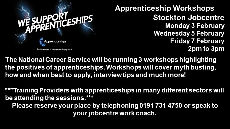 #Apprenticeship Workshops at Stockton Jobcentre by ringing 0191 7314750 get useful advice and information. Live apprenticeships will be available. See full details in the below image#StocktonJCP#ThornabyJCP#BillinghamJCPpic.twitter.com/l5tT2Uw5lf