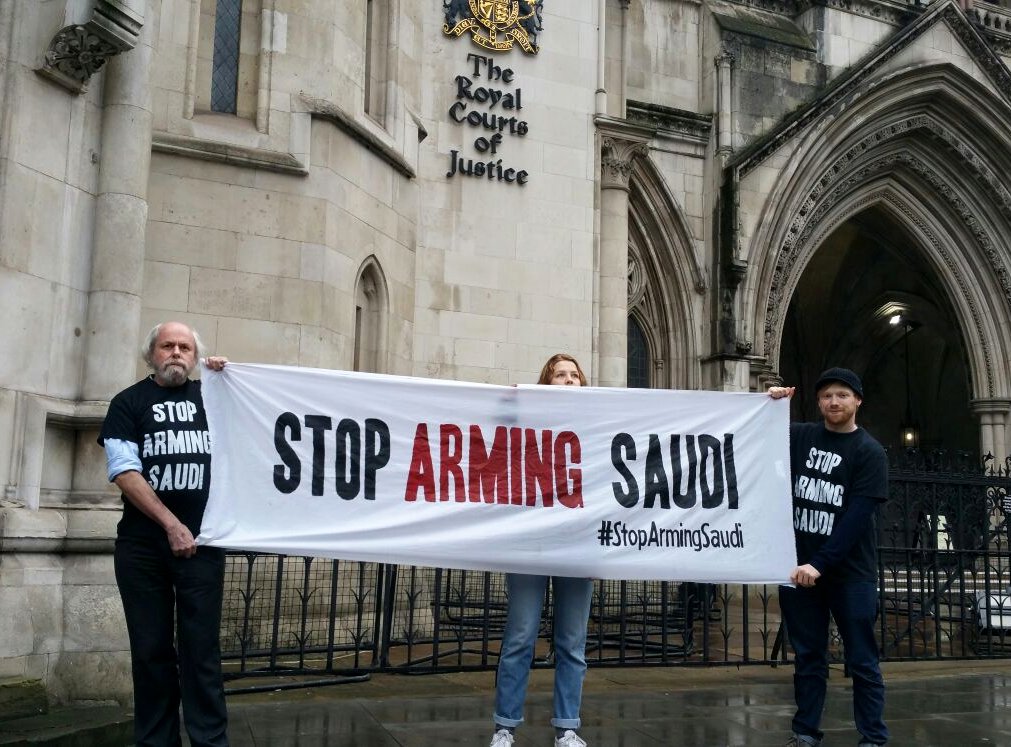 Outside the High Court ahead of today's Judicial Review of UK arms sales to Saudi Arabia http://caat.org.uk/saudi-jr