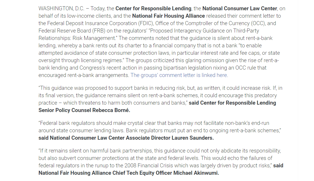 @NCLC4consumers,@CRLONLINE &@natfairhouse released their comment letter to@FDICgov,@USOCC, &@federalreserve on the “Proposed Interagency Guidance on Third-Party Relationships: Risk Management.”#StopTheDebtTrap#ProtectConsumers 1/3https://www.nclc.org/media-center/bank-regulators-proposal-on-third-party-relationships-silent-on-predatory-rent-a-bank-lending-posing-risks-for-banks-and-consumers.html …Show this thread -
