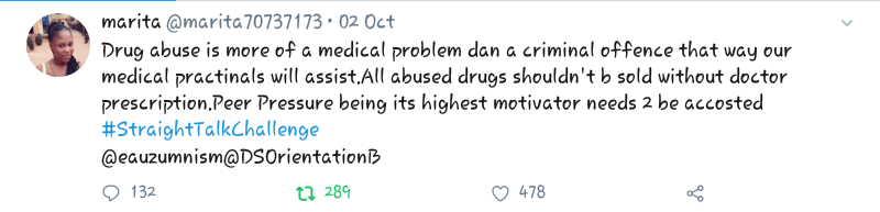 Drug abuse is more of a medical problem dan a criminal offence that way our medical practinals will assist.All abused drugs shouldn't b sold without doctor prescription.Peer Pressure being its highest motivator needs 2 be accosted