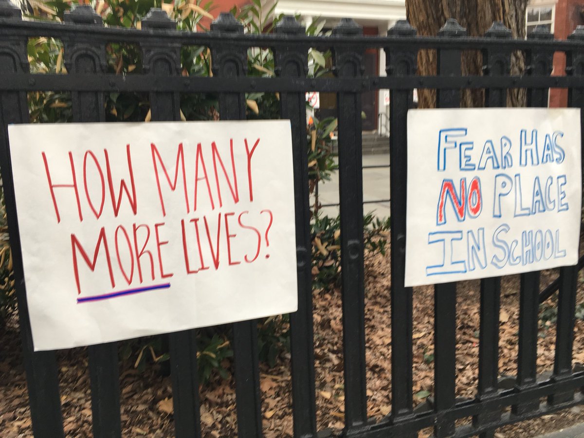 Signs on the gate of the 15th Street Meetinghouse, a Quaker congregation in Lower Manhattan where students have gathered to continue the day of action against gun violence