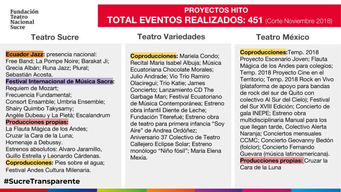 Nuestros eventos realizados en el 2018 fueron 451, entre festivales consagratorios como el Ecuador Jazz y Música Sacra, además de producciones propias y coproducciones.