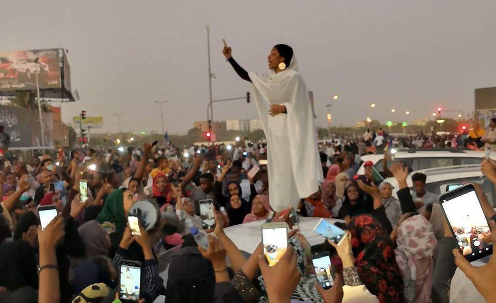 The Sudanese national anthem at the sit-in outside army headquarters, Khartoum,