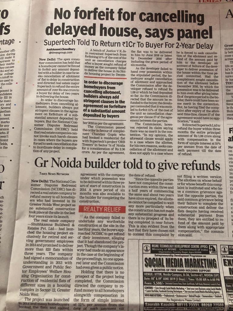 #NCDRC protecting the rights of the#CheatedHomeBuyers .Wish#RERA could implement similar jurisprudence. I see such clauses still exists despite#RERA. Unfortunately#Supertech & few others soon to be like#Jaypee &#Amrapali unless Govt intervenes@amitanandTOIpic.twitter.com/SqsDjyB7iO