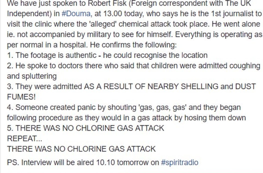 The UK senior Journalist for "The Independent", Robert Fisk in Douma: "There was no chlorine attack"
