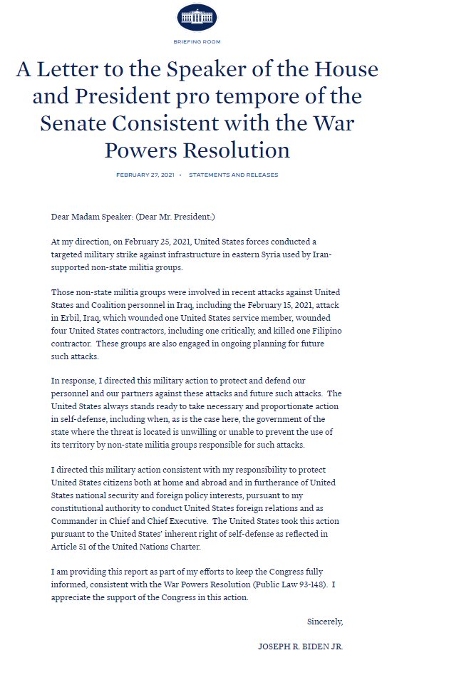 President Biden sends Congress his War Powers Resolution report on