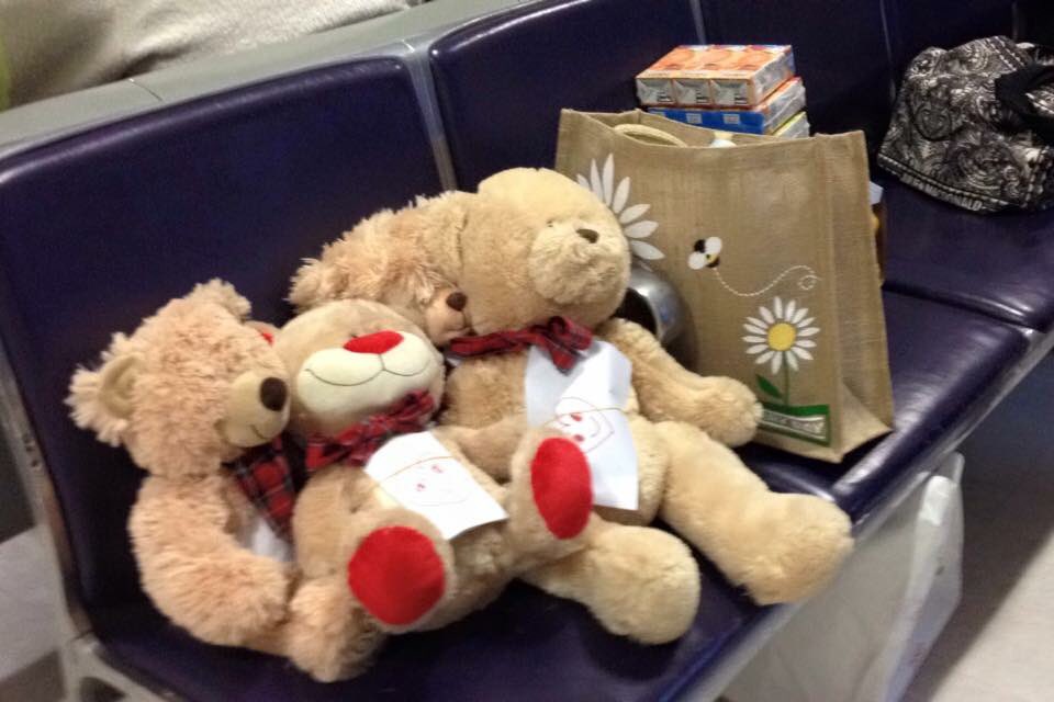 These teddies are waiting at the airport to welcome two