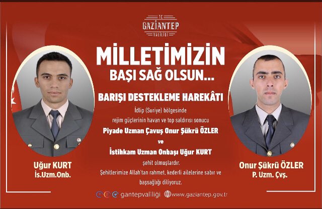 #Türkiye İdlib'de, Rejim unsurları tarafından gerçekleştirilen hain saldırıda şehit sayımız 8'e yükseldi. Gaziantepli askerlerimiz Onur Şükrü Özler ve Uğur Kurt dahil 3'ü sivil personel, 8 şehidimize Allah'tan rahmet, yaralı askerlerimize acil şifalar dilerim. pic.twitter.com/fzbpkV7qcI