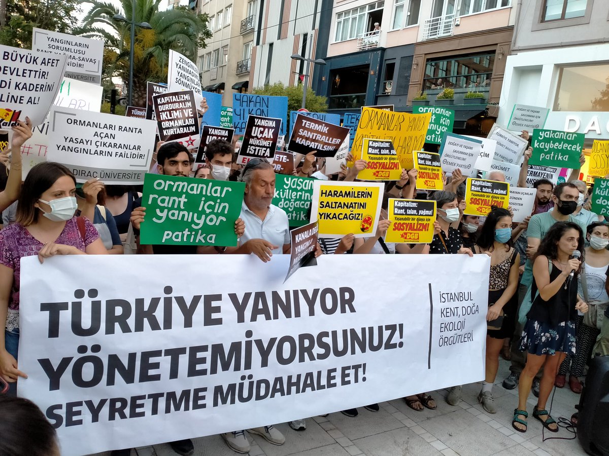 İstanbul Kadıköy'den sesleniyoruz: Türkiye Yanıyor Yönetemiyorsunuz! Yangınlara karşı önlem almayan iktidar güçlerine karşı doğa ve yaşam mücadelesini büyütüyoruz. Yağma ve rant düzenini reddediyoruz. Ekolojik toplum için mücadeleye çağırıyoruz