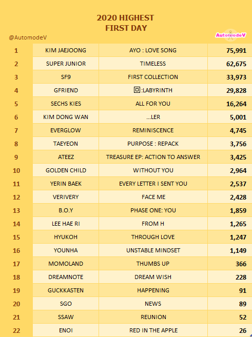 #HANTEO 2020 HIGHEST FIRSTDAY #1#KIMJAEJOONG #2@SJofficial#SUPERJUNIOR #3@SF9official#SF9 #4@GFRDofficial#GFRIEND #5#SECHSKIES #6@ShinhwaCompany#KIMDONGWAN #7@EVERGLOW_twt#EVERGLOW #8@GirlsGeneration#TAEYEON #9@ATEEZofficial#ATEEZ #10@Official_GNCD#GOLDENCHILDpic.twitter.com/mI35tR0ETz