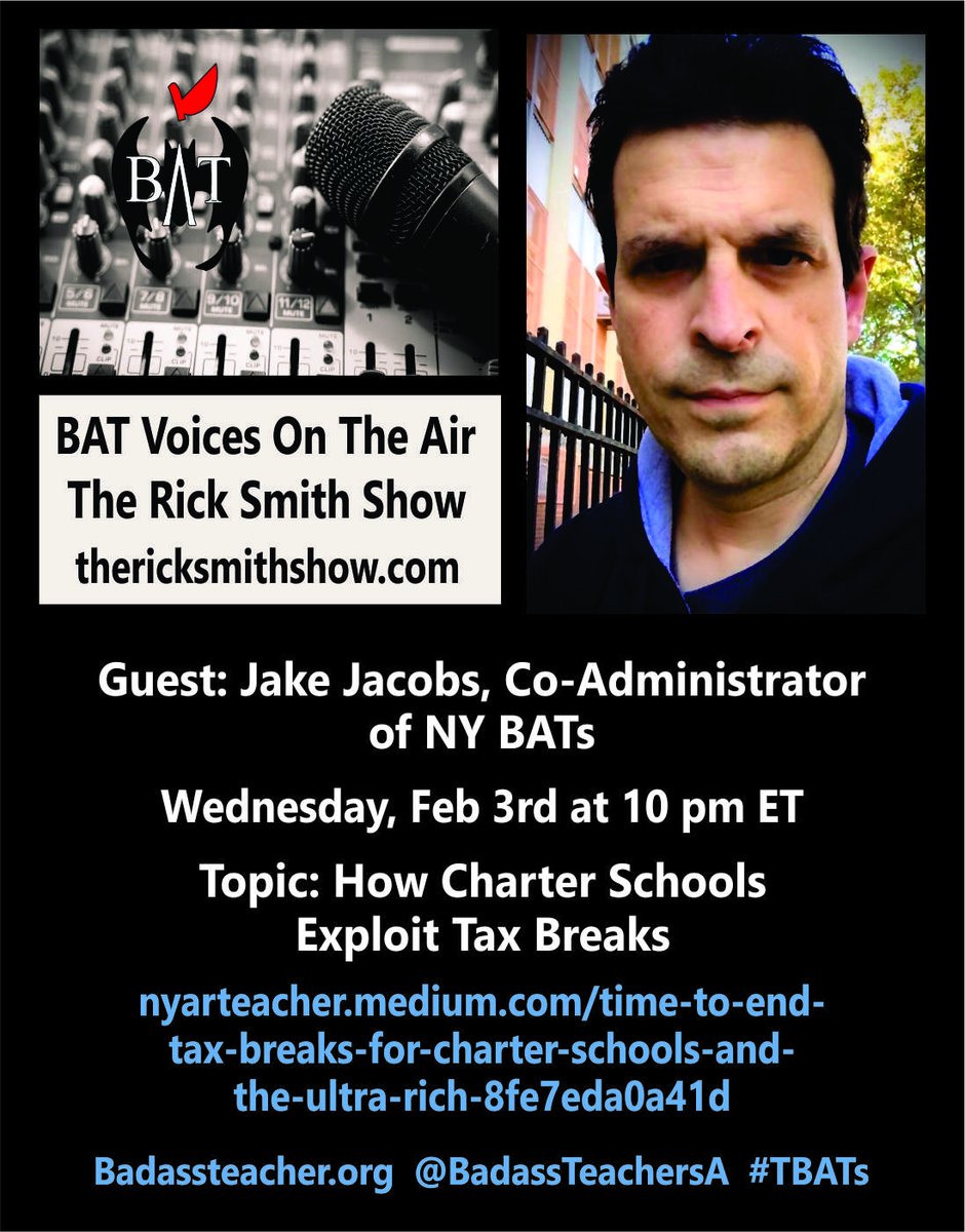 Join Rick Smith & Jake Jacobs on http://thericksmithshow.com for a great discussion on how the rich get huge tax breaks for investing in charter schools, even though that decreases funding for public schools. Wed. 10pm ET. https://nyarteacher.medium.com/time-to-end-tax-breaks-for-charter-schools-and-the-ultra-rich-8fe7eda0a41d …