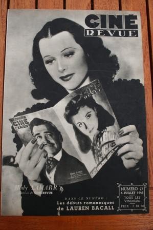 Hedy Lamarr reading a copy of Cine Revue, with Vivien Leigh on the front cover and Clark Gable on the back.