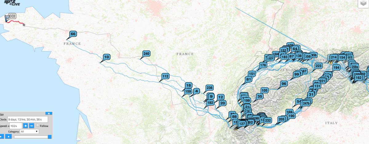 #tcrno7cap66 is leading the Transcontinental race - she is in France. Two pursuers are in Switzerland. All other 219 active racers are trailing by at least a country. Amazing.#tcrno7 pic.twitter.com/wvuUaqT6IZ