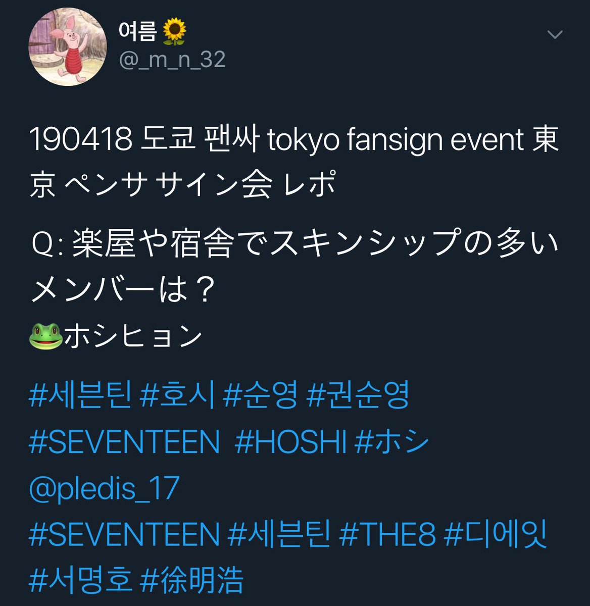 190418 Tokyo Fansign Q: Which member does a lot of skinship in the dressing room and the dorm? Minghao: Hoshi-hyung cr _m_n_32
