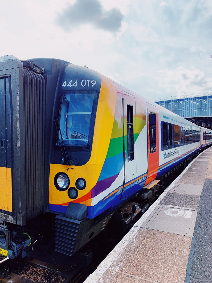 @SW_Help in new#trainbow livery SWR 444019 Seen approaching Eastleigh working 1W12 Weymouth to London Waterloo at 11:40#pridetrainpic.twitter.com/2g9JosWmvO
