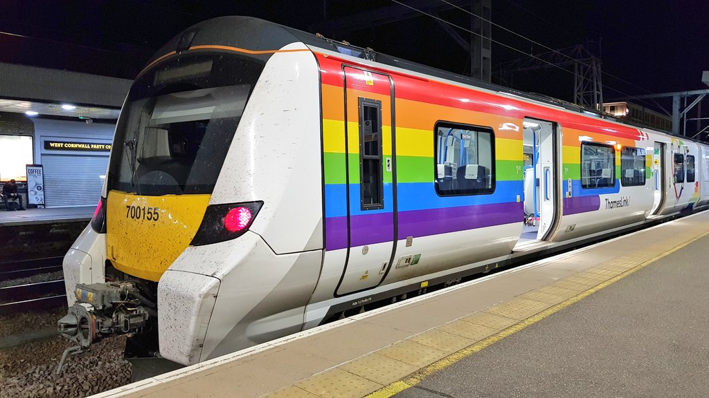 @TLRailUK’s fabulous#trainbow 700155 in platform 5. Been looking out for this one for weeks!