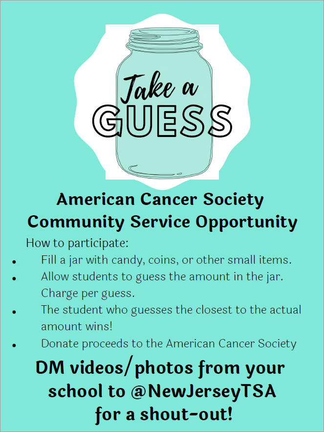 Did you know that TSA's National Service Project is with the American Cancer Society? TSA chapters raise money to donate. Each month, NJ TSA will promote fundraising ideas for all chapters to implement in their schools!