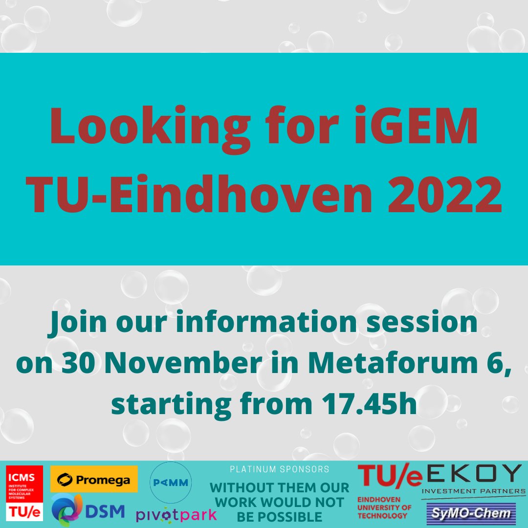 We are looking for a new team! Are you interested in joining a studentteam and want to learn about synthetic biology? Then send an email to igem@tue.nl to let us know you will be attending.
