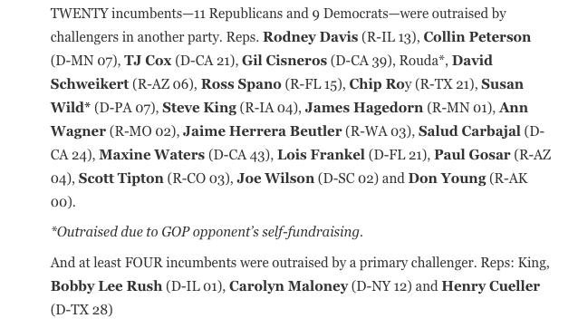 Some more Tales from FEC Deadline. 20 incumbents were outraised by challengers and 3 Democrats were outraised by primary challengers. The primary race to watch is down in