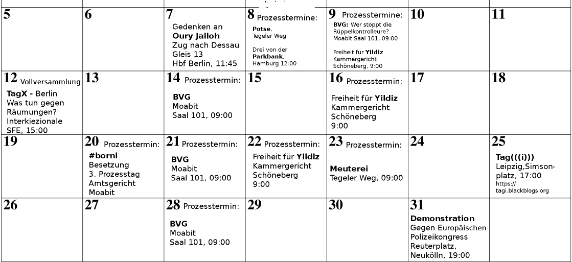 Terminplan für den Januar. Nehmen wir uns ein Beispiel an der Performance der Liebig34 o. den 3Heinis vor Gericht.Solidarität statt ein Warten auf TagX!Freiheit für die 2 von der Parkbank!