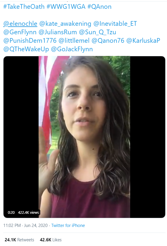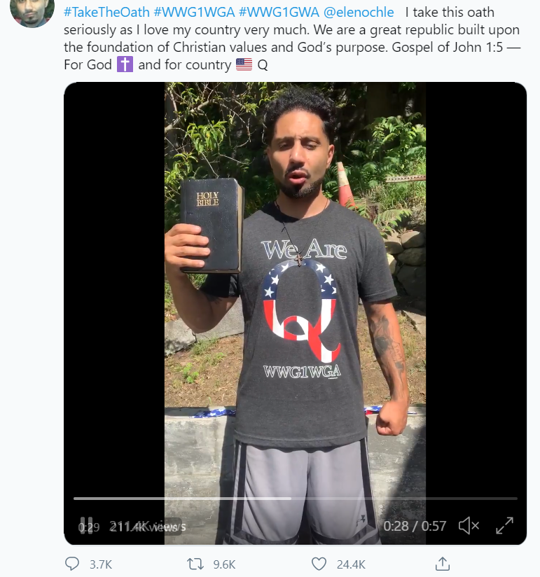 Q asked believers on 24 June to "take the oath". This prompted a wave of QAnon believers posting videos of themselves doing exactly that using