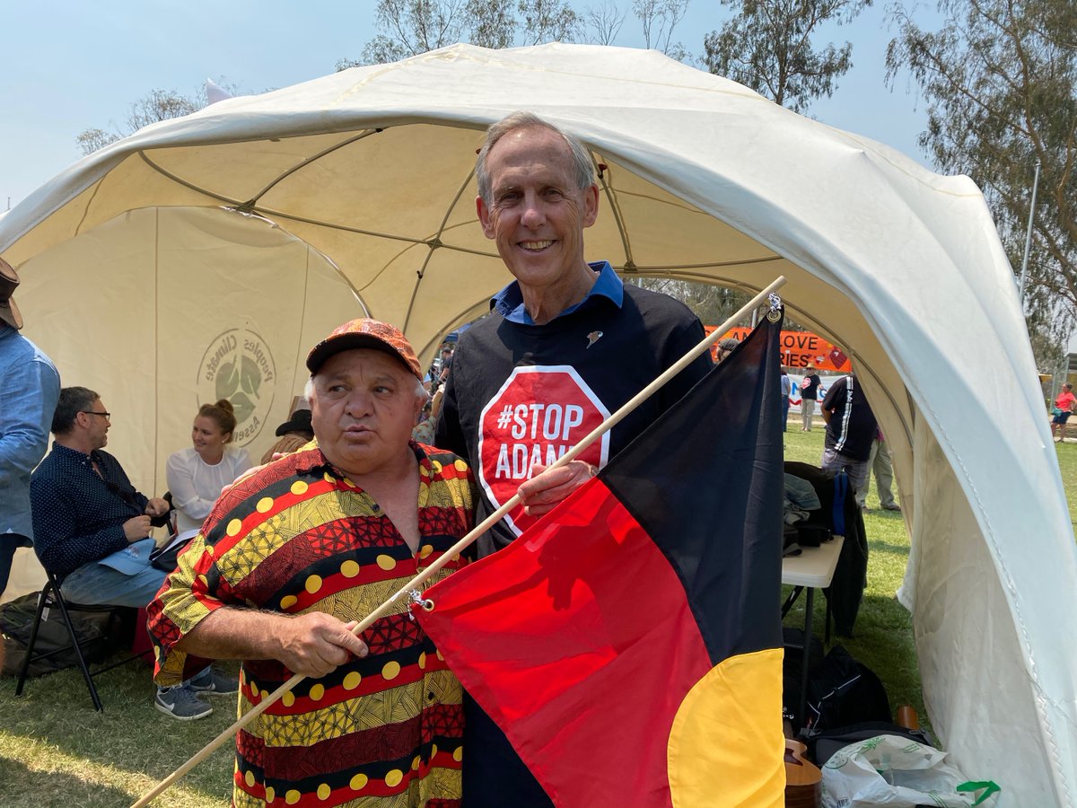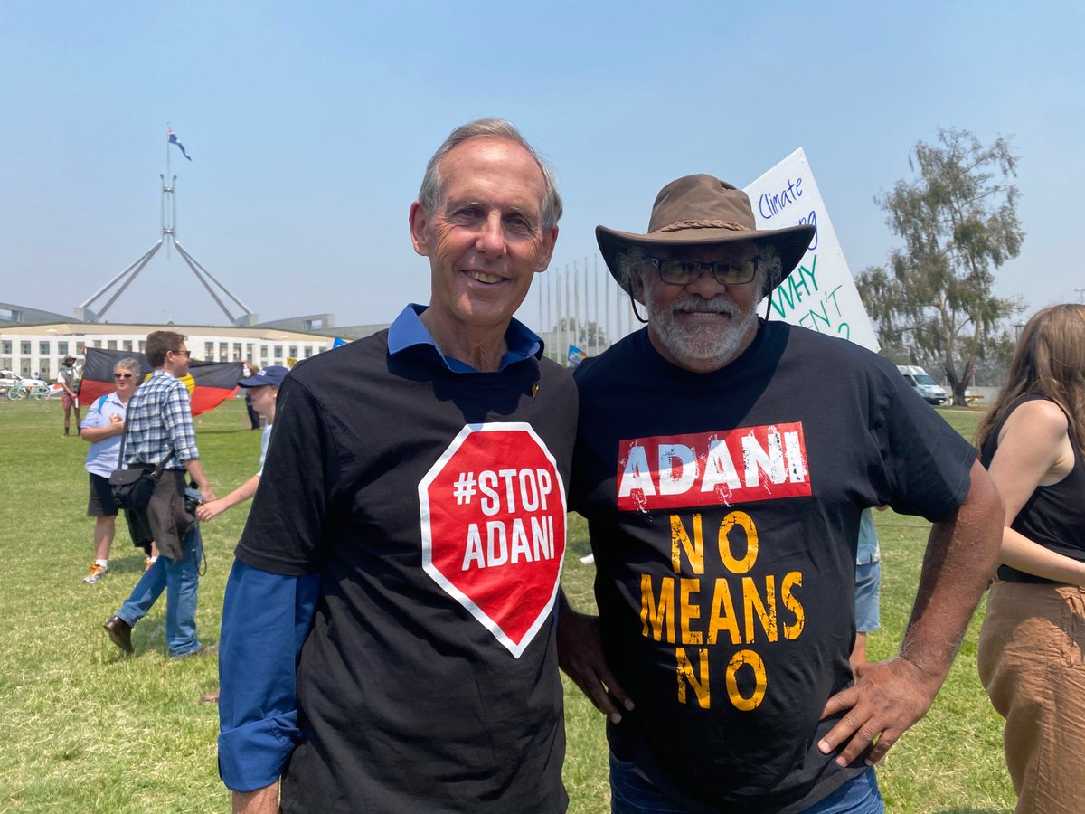 Bob Brown at the Climate Emergency Rally, Parliament House Canberra, with Adrian Burragubba, Johnny Huckle and farmers for climate action all demanding our Government declare a climate emergency.