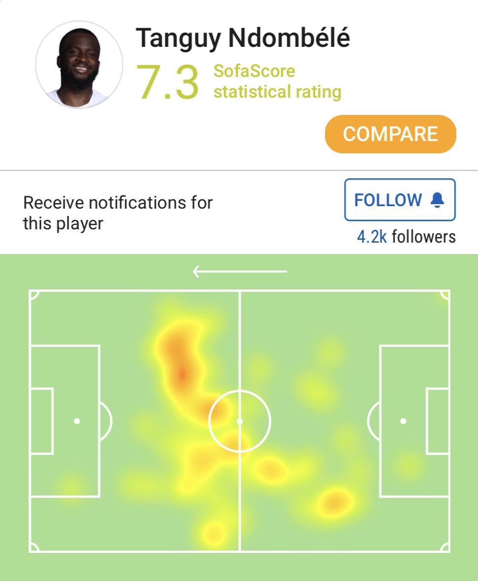 Tanguy Ndombele: 45 minutes 62 touches 1 key pass 91.5% accurate passes 100% long ball accuracy (2) 100% dribble success (2) 10 ground duels won (71%) 3 tackles 5 fouls against