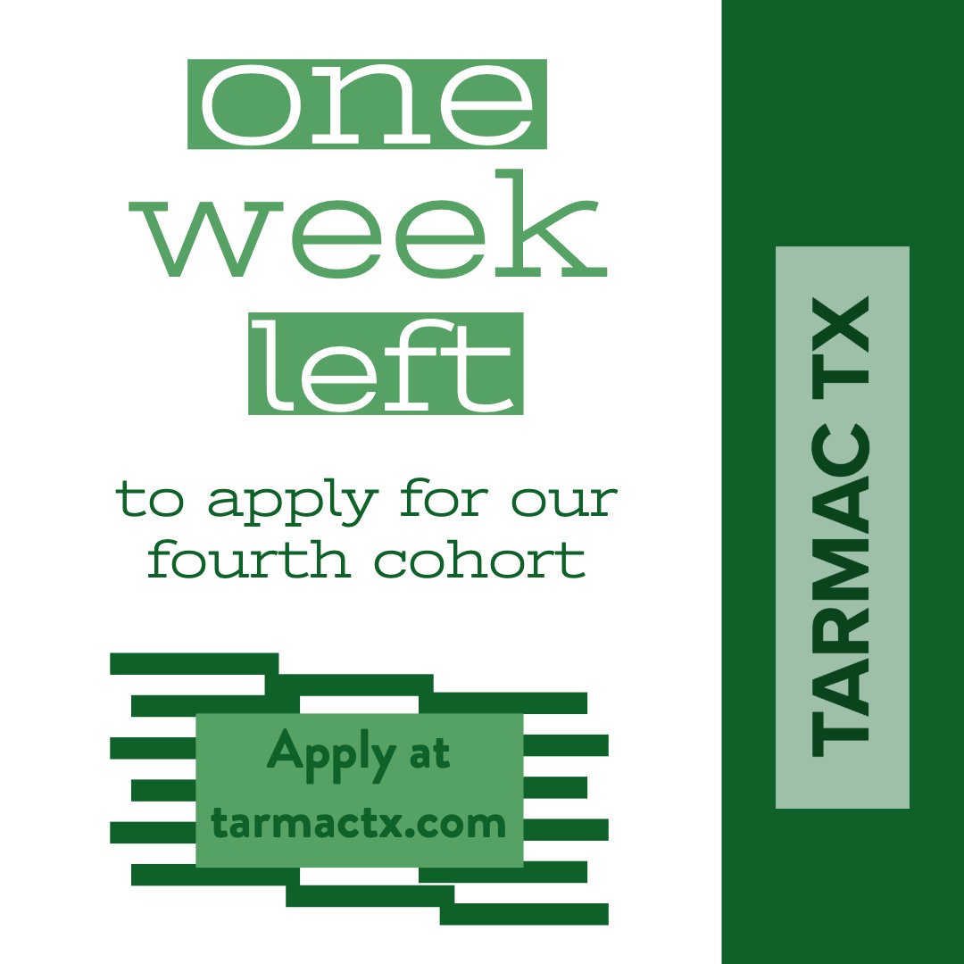 LESS THAN A WEEK TO APPLY for our 4th cohort! Tarmac TX is going GREEN for our 2019 Cohort! APPLY by 6/30/2019 : http://tarmactx.com/apply Sponsored by