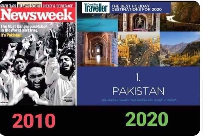 #TenYearChallenge of Pakistan. In 2010 it was most dangerous place to visit because of terrorism. In 2020 it's No 1 travel destination. Credit goes to LEAs for reviving peace of Pakistan. Long live