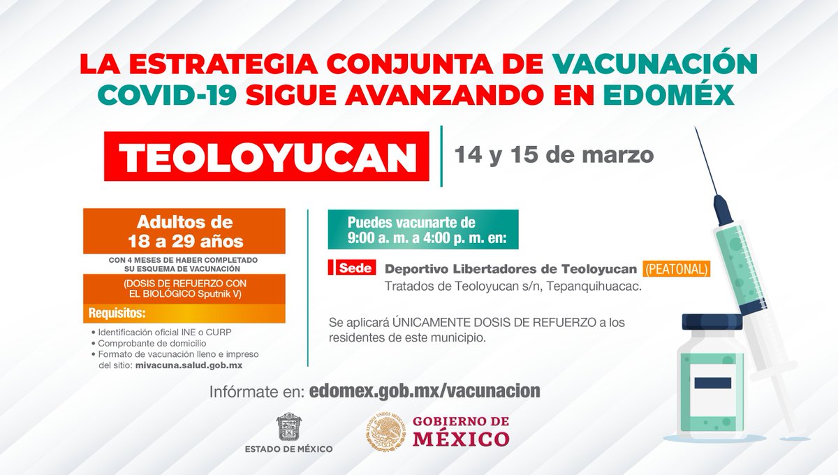 #EstrategiaDeVacunación contra el#Covid_19mx continúa en el#Edoméx. Consulta las sedes y horarios donde se aplica la dosis de refuerzo para personas de 18 a 29 años en#Teoloyucan. https://twitter.com/Edomex/status/1503762956760330242 …