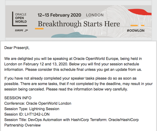 If you are attending Oracle Open World London then come and join my session "DevOps Automation with HashiCorp Terraform"