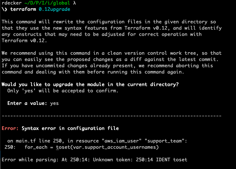 I create some of my resources using a ```for_each = toset(http://var.name )``` but I can’t make it work with the 0.12 upgrade. I always have a “Error while parsing: Unknown token: 250:14 IDENT toset” error :’(pic.twitter.com/qNDHCdCc24