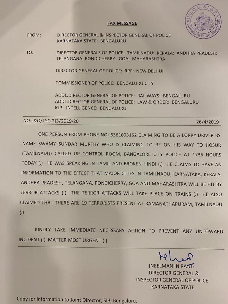 @KALLIVAYALIL Stay Safe guys... Bengaluru Police Warns Tamilnadu About the possible terror attack in Tamilnadu in major cities & other southern states.#TerrorAttack#EasterSundayAttacksLK#SriLanka#Tamilnadu#Chennaipic.twitter.com/tIgD0Zyqlt