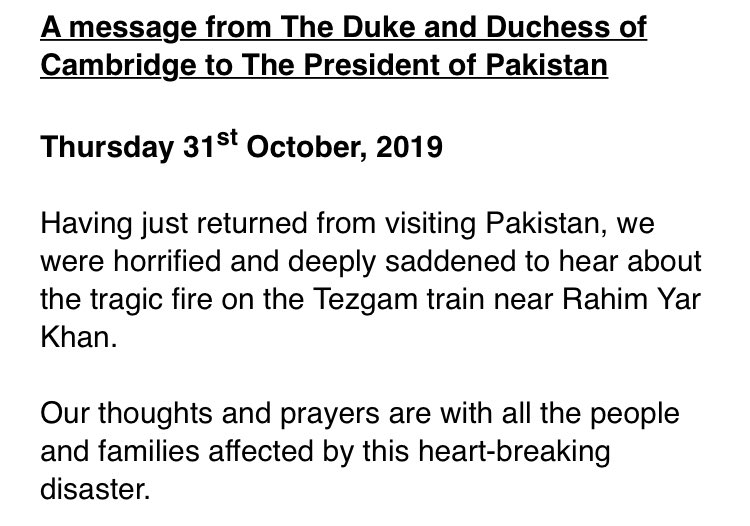 William and Kate say they were ‘horrified and deeply saddened’ to learn of the train disaster in Pakistan. The Duke and Duchess of Cambridge were in the country for