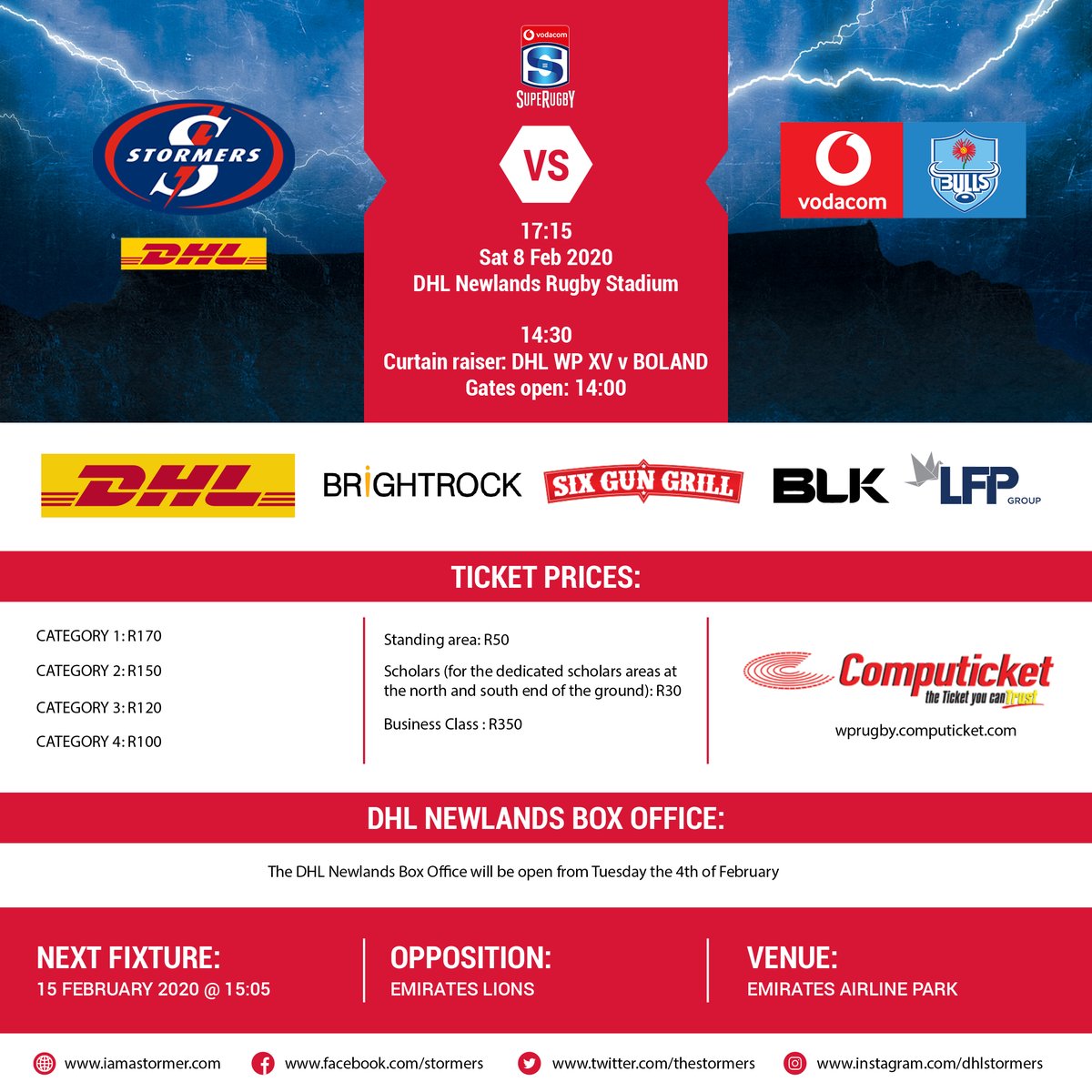 We are back at it at 17h15 on Saturday at DHL Newlands where the DHL Stormers are up against the Vodacom Bulls. Get your tickets now from Computicket.