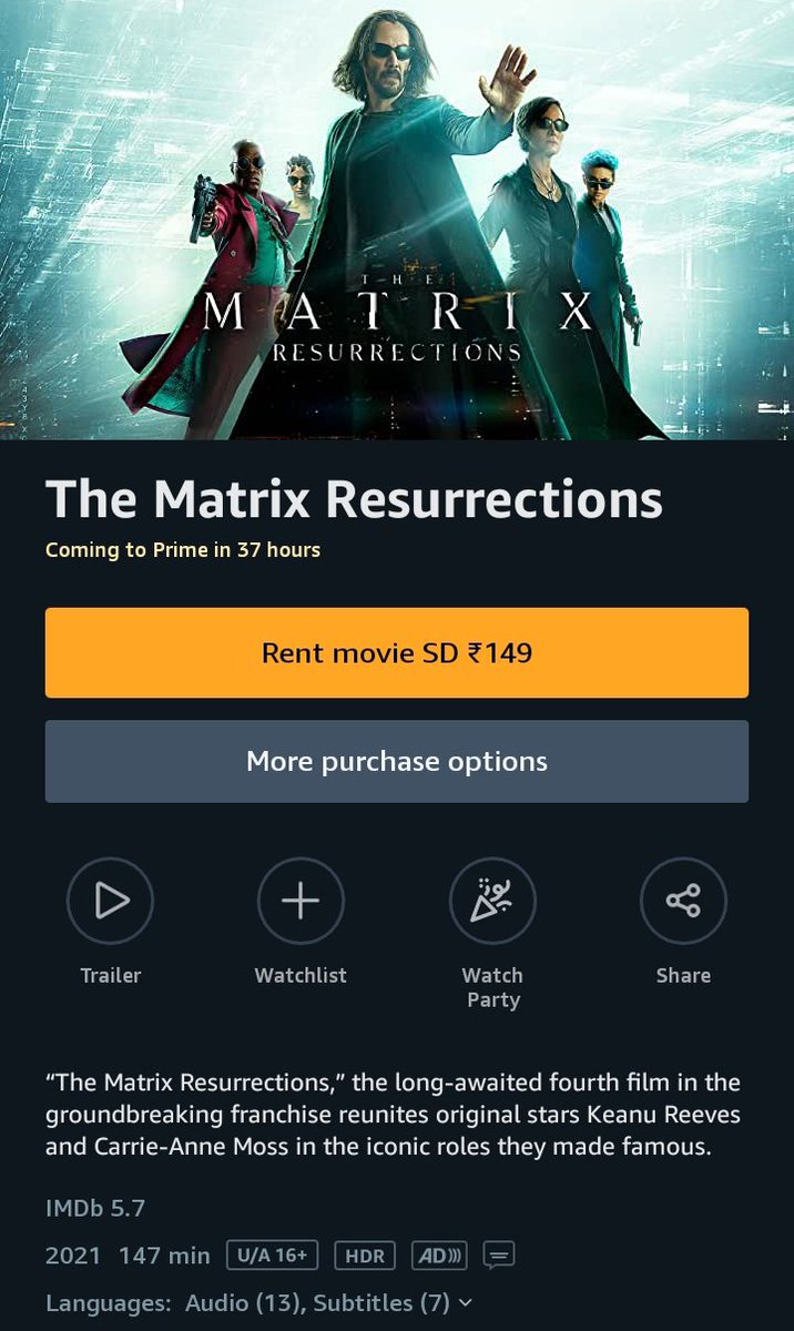 #TheMatrixResurrections Now Available For Rent (At ₹149) On Prime Video & Will Be Available For Prime Members From May 12th Link:https://app.primevideo.com/detail?gti=amzn1.dv.gti.0c1aa7d8-75fa-4c25-8891-58c3abab2085&ref_=atv_dp_share_mv&r=web … Also Available In Hindi, Telugu, Tamil & Malayalam#KannadaDubbedpic.twitter.com/xg467ZpnIe