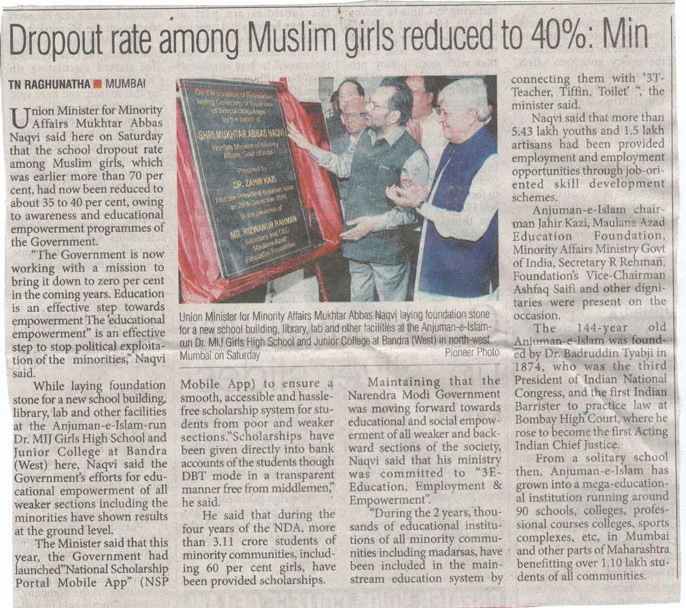 The Pioneer 30.12.2018. Dropout rate among Muslim girls reduced to 40%