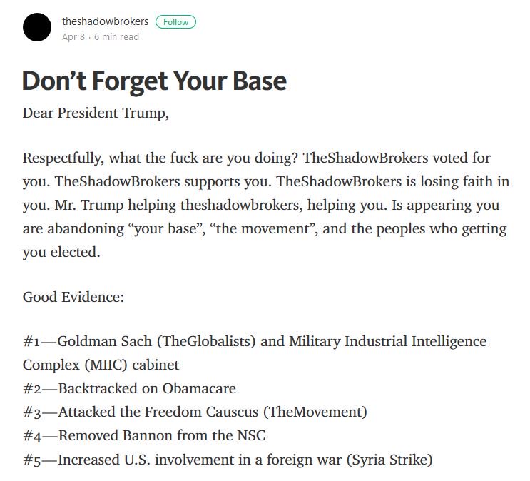 You can replace "TheShadowBrokers" with "the Russians" and it still makes sense