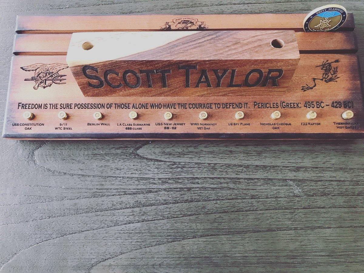#honored &#humbled to receive pen/coin holder from a retired#teammate Top wood is from#afghanistan. The bullets were shot by SEAL operators, each with shavings of something significant inside them. Wood from the USS Constitution, Berlin Wall, 9/11 WTC, sand from#thermopylae. pic.twitter.com/Qh0o8Mg1Va