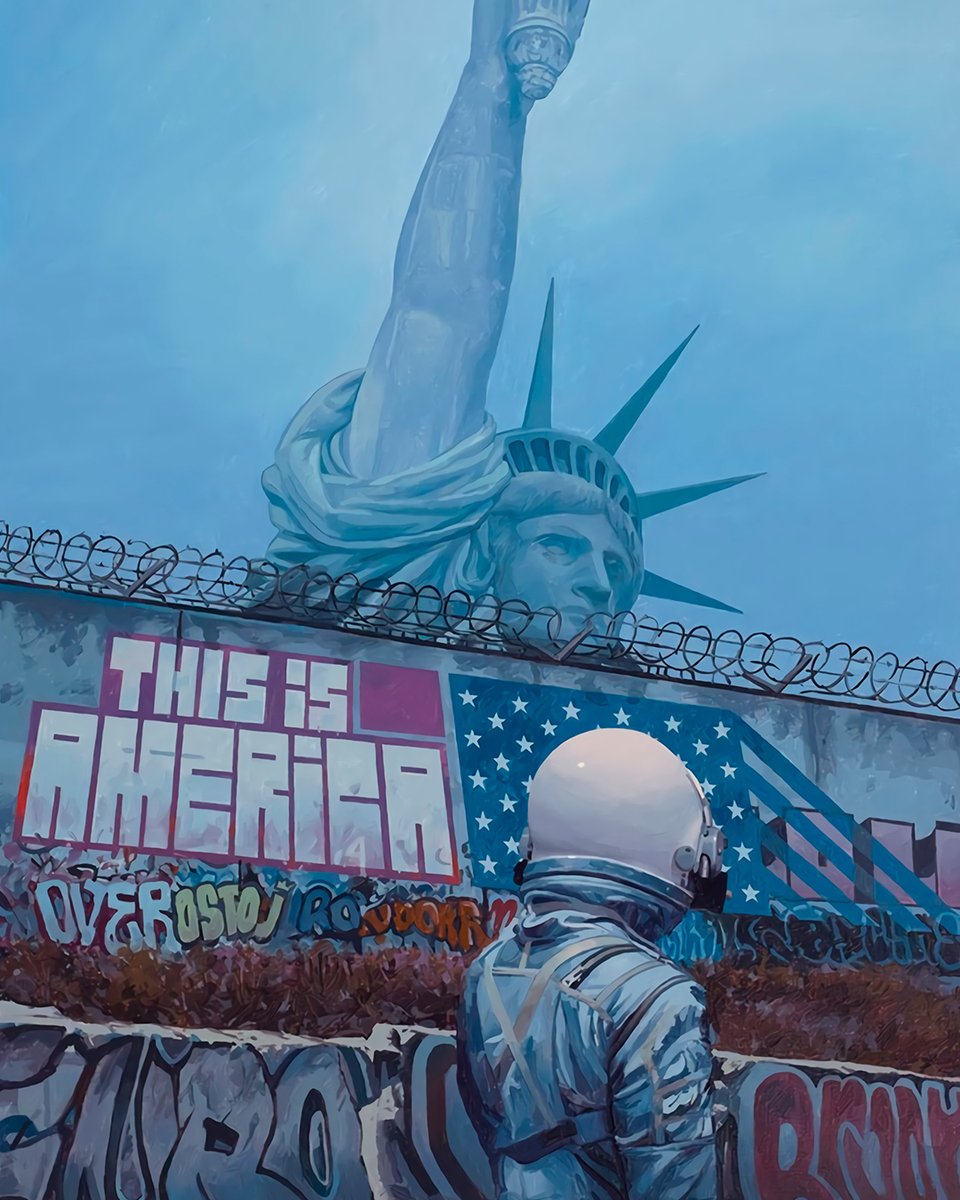 @scottlistfield is known for his paintings featuring a lone astronaut lost in a landscape cluttered with pop culture icons, corporate logos, and science fiction references. His latest series#ThisIsAmerica represents the '2020 dystopia of your choosing.' pic.twitter.com/tw4OuvfbVO