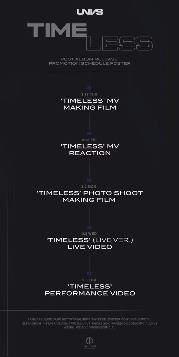 #UNVS POST ALBUM RELEASE PROMOTION SCHEDULE POSTER#유엔브이에스#Timeless pic.twitter.com/Ysdb0OjczA