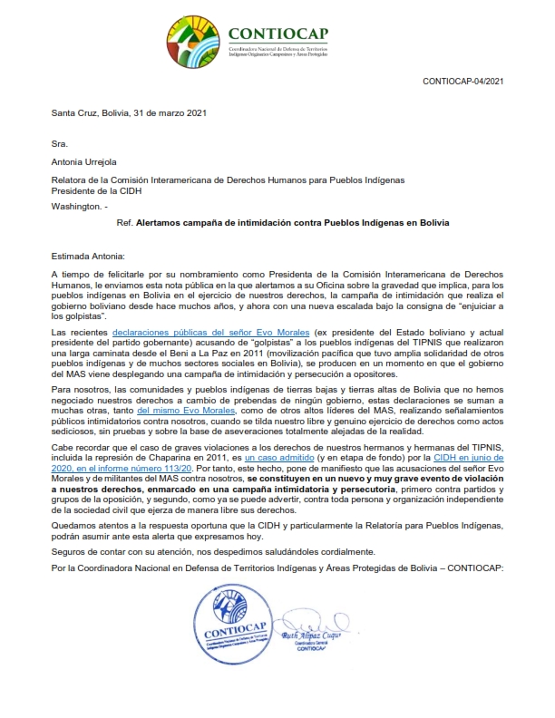 @contiocap has sent an open letter to the@CIDH President@totonia68, denouncing an "intimidation and persecution campaign" by ex president@evoespueblo, who has been claiming the March for the#TIPNIS in 2011 was a "coup attempt".#Bolivia#ChaskiReporthttps://twitter.com/contiocap/status/1377400024439525376 …