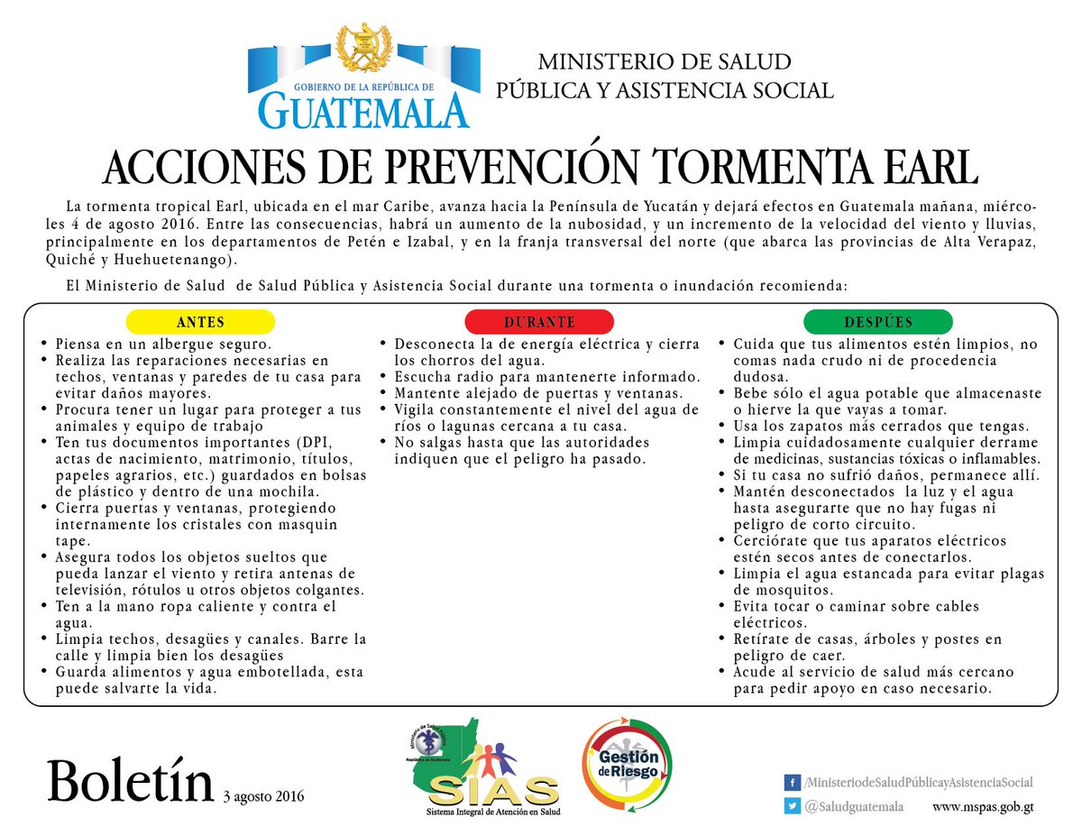 #AccióndeprevenciónMSPAS La#TormentaEarl está próxima a dejar efectos en el país, tome nota de lo siguiente. pic.twitter.com/Tx59jc3qQh