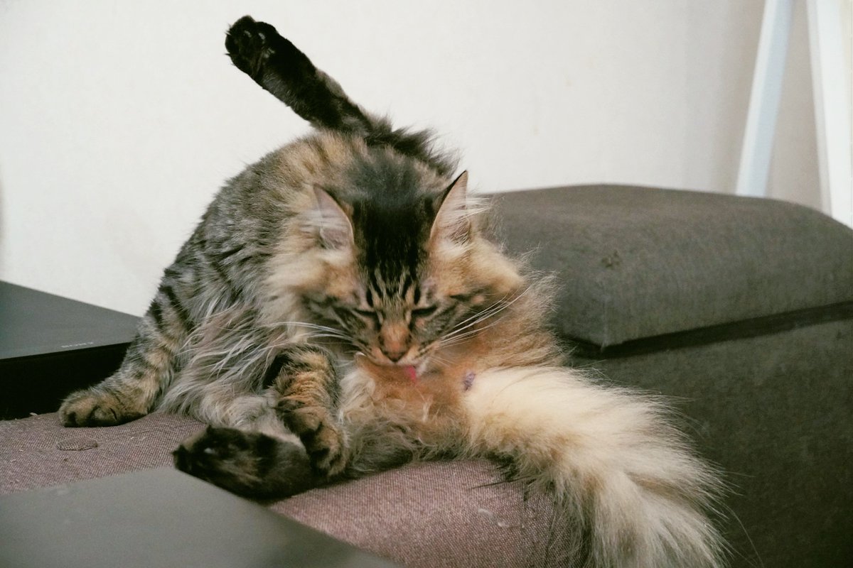 寝る準備しよー。 毛づくろい大胆ねこ。 Torte です。