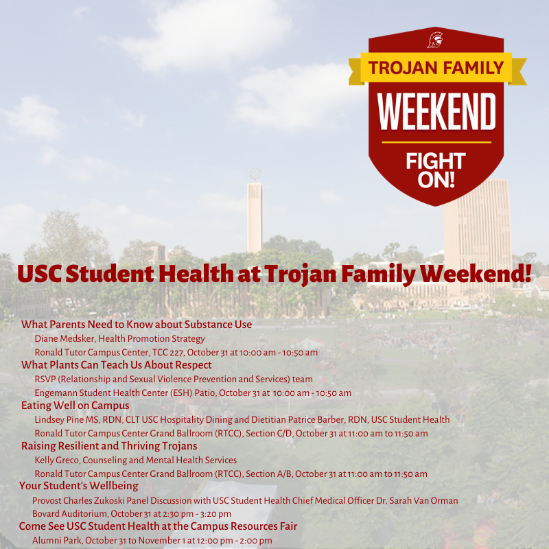 #TrojanFamilyWeekend starts tomorrow! Come join USC Student Health for workshops and at the Campus Resource Fair! pic.twitter.com/0ptEsZvvWQ